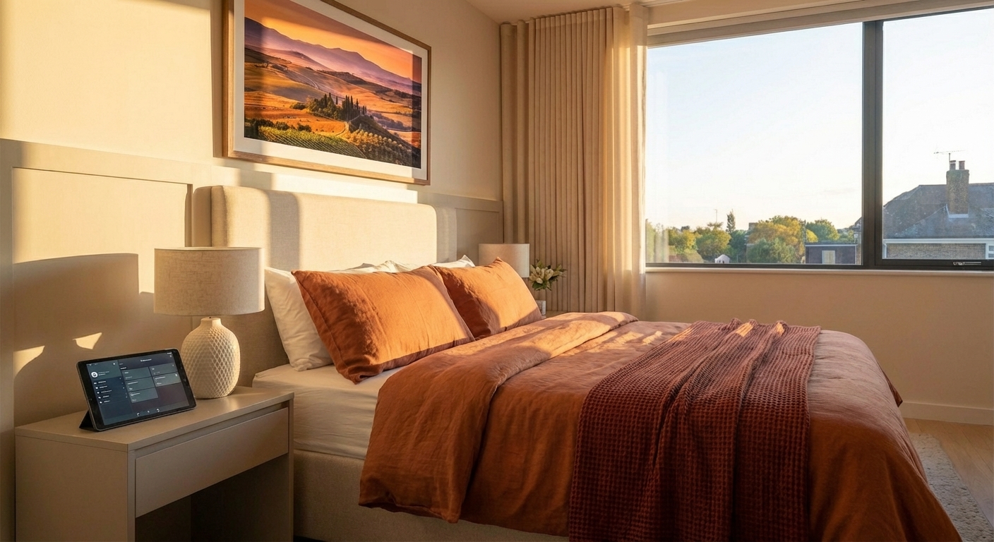 Wake up to light that rises gently, warmth that's already there, and blinds that open just as you're ready. No fumbling. No cold floors. Just a lovely start.